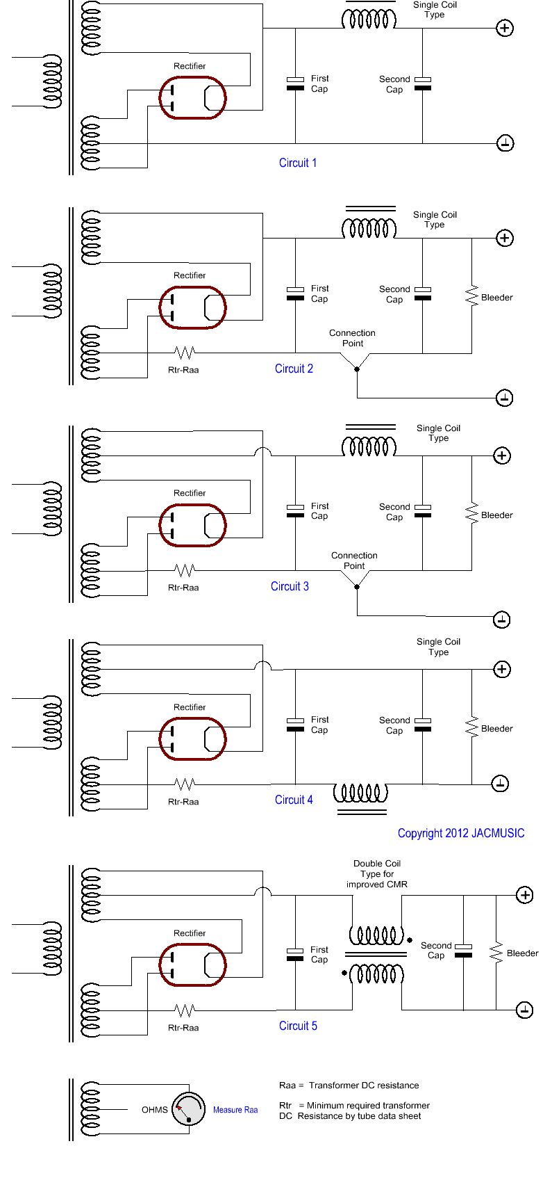 If there is hum, you would be tempted to tweak components values, but better would be to use an improved circuit, if the problem is the circuit itself. The most commonly used circuit is Circuit #1, as below here, but this is a source for grounding errors. In many cases, simply use circuit #2 already brings an improvement. We call this 'star grounding'. Though Circuit#2 is far from ideal, and Circuit #4 does the same even better and with less wiring. Circuit #3 shows one of those typical little things, you can observe when somebody does not treat a tube like a solid state diode. This makes sure the left side of the tube heater wire has the same current (and the same temperature by that) as the right side of the heater wire. Whereas Circuit #4 is such a logical and easy thing to do, but people do not understand why, and take Circuit #1, this is really painful. It is allowed to use Circuit #4, also if you do not understand why it is better, as it is free of patent rights. The words are: No ground loop risk, and electrical stray field. Circuit #5 is the ultimate circuit. Only possible with Lundahl chokes. This is the most beneficial circuit ever, for lowest hum. The choke is not only used here as an inductor, but also creates inductive decoupling of the complete rectifier parts from the amplifier circuit. There is no direct connection any more! All hum signals, no matter how they try to flow, must pass a choke now. Please also read the short explanations on the right, below here. After that I hope you understand why we say it is so silly to find Circuit #1 in most 'professional' designs.