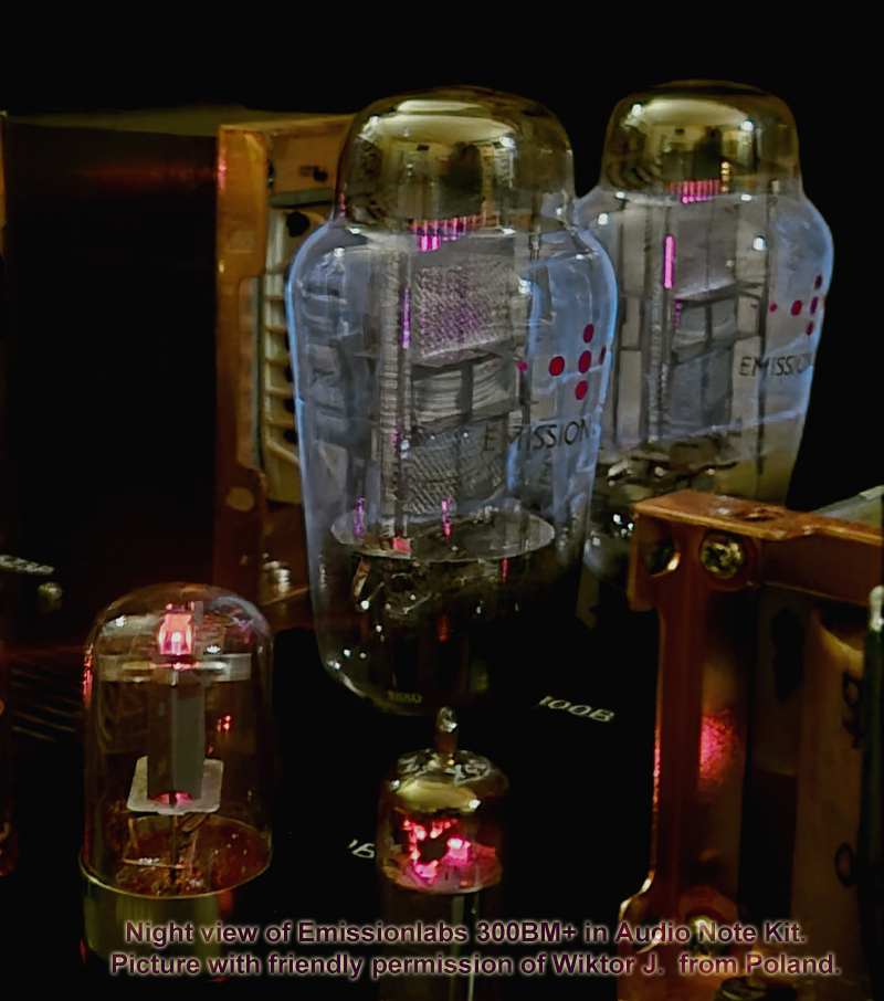 With low to medium efficiency speakers, relatively high output power at low distortion is required. Another requirement is, distortion should increase as little as possible, during the aging process. This requirement is often overseen, because tube owners have a high lifetime expectation anyway, even though this tube is loaded quite hard by some amplifiers. So the 300B has to build with as much as possible reserve emission. This is just what we are doing at EML. Low distortion needs emission reserve.