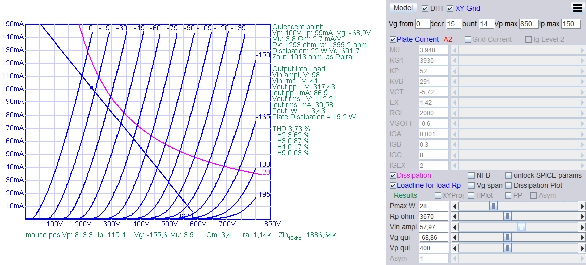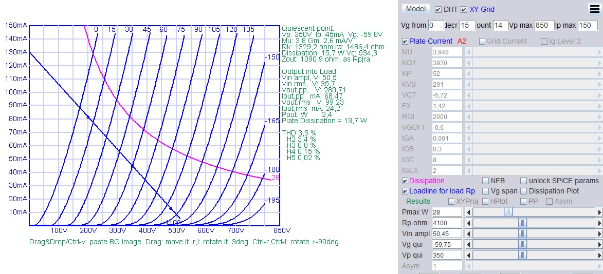 *1 These working points are identical to the historical data sheet. Note: We have calculated distortion of the EML50, at the power level of the RCA data sheet. The simulation shows, these are well chosen working points, considering the relatively low working voltage. The EML50 has somewhat higher efficiency, and appr. 15% more output power will be achieved. |