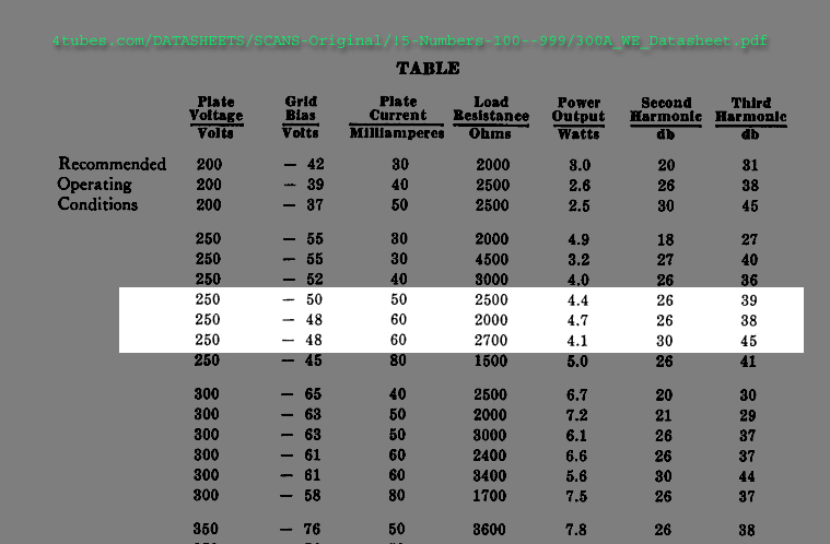 The above table shows three working points from the 1930's Western Electric 300B data sheet. The last working point shows 250V, 60mA, -45V bias. This is identical to the 2A3 tube. This means the tube will bias normally in any 2A3 auto bias circuit. Yet dynamic parameters are slightly different, which indicates sound will be slightly different as well. Due to the somewhat higher load (2A3 is loaded with 2k5 normally, vs. 2k7 required here for the 300B) the output power may be slightly increased accordingly. Also it can be seen, the 300B works in a range with the lowest distortion here, 30dB 2nd harmonics and even 45 dB 3rd, harmonics. Such good numbers can also be expected from the 300B-25.
