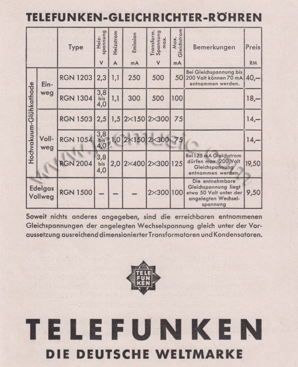Whereas RGN2004 can do both, but general at lower current. Also this tube is heavily limited in DC voltage, it can be only 200VDC at maximum current of 125mA. Only at lower current, voltage may be higher. This is from an original Telefunken flyer (See above).