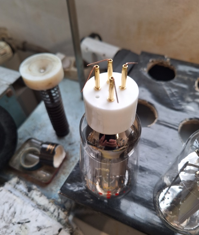 One of the real secrets of tube making is tube activation. This is a complex process that needs to be done to make a new build tube come alive. Modern tubes will not 'just work' by vacuum pumping. The tube is heated inside an microwave generator, and while the filament is treated electrically in a special way, slowly the gas pressure will fall, and the tube comes alive. When the filament is switched on for the first time, a cloud of dirt (in gas form) will come out of it, and the gas pressure in the tube will rise while doing this. Simultaneously, the filament emissive coating starts to build. At this critical moment the gas is attacking the new born filament, and tries to poison it. This is unwanted, but unavoidable. While doing so, the vacuum pumps run at full power, eliminating the gas quickly. The person who does the activation process, is now doing something with great influence on the tube lifetime. There are many quick ways to do this less good. The right way is very time consuming and requires monitoring of the gas pressure all of the time. (Here you see one difference between hand made tubes and machine made tubes) Now, once the filaments stops producing gas, the bulb pressure will fall quickly to it's final value and while this happens, the filament develops it's initial function, meaning only it works in some way, and the tube can now be electrically heated. The better the operator has control of his process, the longer the tube will live, and his patience is the keys to good result. After this step, the final activation can be started, at the end of which the getter will be flashed, to create a vacuum which is so good, it can not be measured with normal instruments any more. When the getter is flashed, this is the final step of activation. During a few seconds the getter material will be evaporated from the getter ring, and from there condense on the glass. During this moment, when the getter metals travel to vacuum, it catches all gasses on it's way. After this, the getter metal is now on the glass, and is much less active now. Cleaning function is very low, and is increased at higher temperature. There are some pro's and con's for every position of the getter flash, like at the bottom, at the side, or at the top. Also optical reasons come in of course. A nice place would be at the back of the tube, opposite to the Anode, but nobody wants that, you can only like inside from one direction.